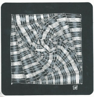 This day of Zentangle celebrated the black Zendala. Once again we used scissors and glue. The white Zendala tile has two butterfly shaped cut outs so you can see the black Zendala beneath, and the Knightsbridge tangle pattern done in white fills that space. Pepper spirals look like candy fun and kissing Mooka's reach and twine. I don't think my version quite captured the magic, but I had a good time doing it.
